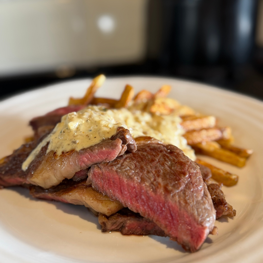 - Plate the Wagyu ribeye alongside the crisp fries and spoon over the rich green peppercorn sauce.